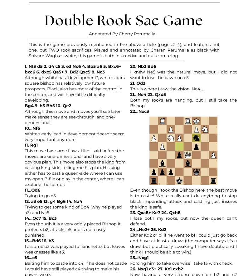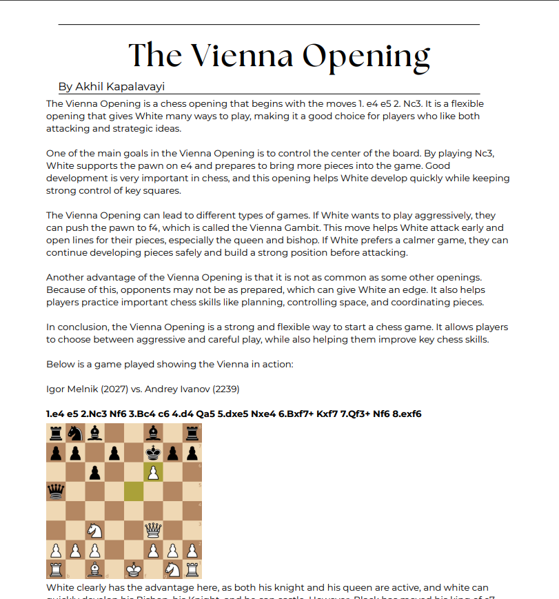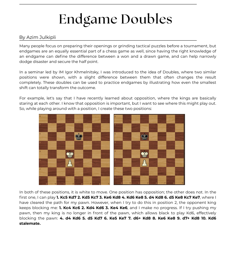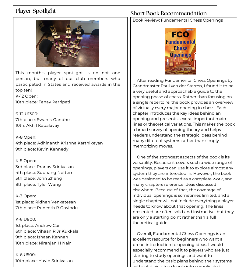 We also take a look at the classical Ruy Lopez opening for those interested in central pressure, while club members Samika Nettem and Pallavi Rajeev share their firsthand experiences and lessons learned from competing on the national stage. To top it off, we celebrate Aayan Bhowmik for breaking the 1000 rating barrier and feature a great workbook recommendation for kids looking to sharpen their endgame skills. Whether you're here for the personal stories or the high-level analysis, this issue has everything you need to start your year of chess on the right foot!