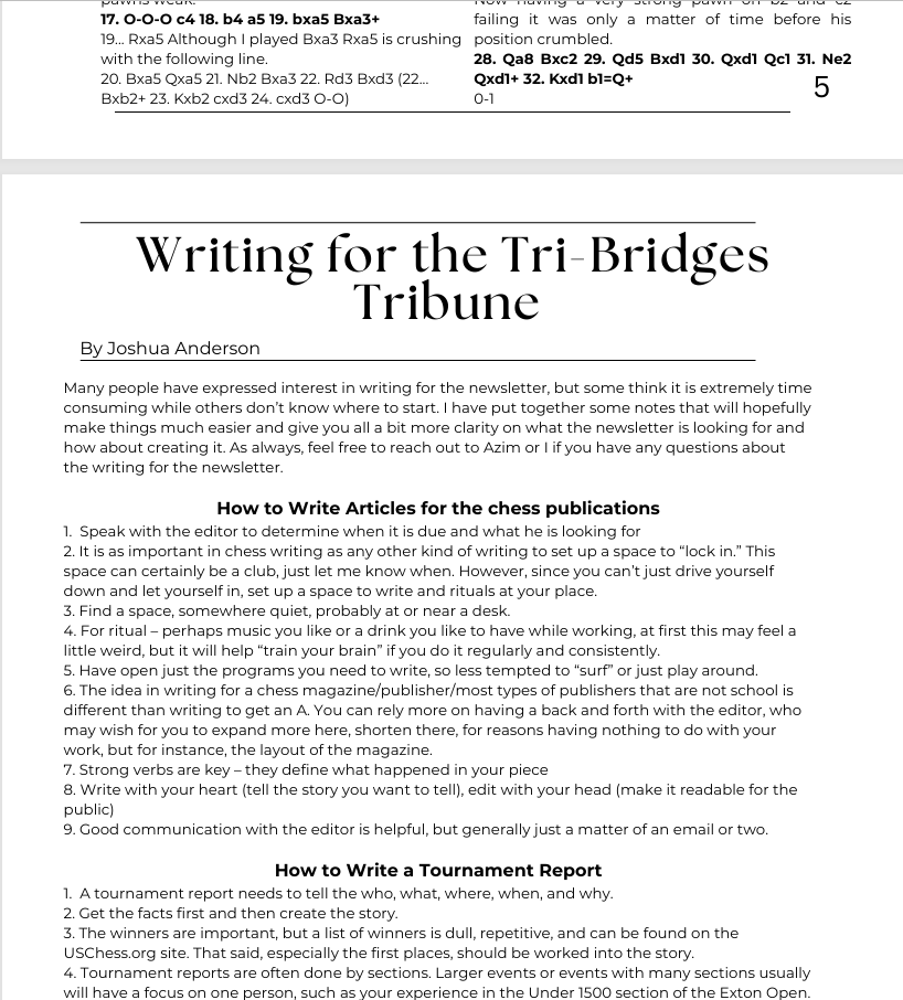 Our community has grown so much over the years, and the February 2026 issue of the Tri-Bridges Tribune perfectly captures that ongoing journey. Located at 666 Exton Commons, we continue to meet every Tuesday for friendly games and socializing, but our members are also making waves far beyond our weekly meetings. In this month's newsletter, you'll read all about a fabulous weekend at the State Championships, where an impressive 81 players braved freezing temperatures to compete. We celebrate our club's champions, including a special spotlight on dedicated 7th-grader Lily Neilson, who secured a perfect 5-0 score at the Winter Open. You will also hear firsthand experiences from our players who recently competed in the massive 58th Liberty Bell Open. Beyond tournament reports, this issue offers fantastic resources to elevate your own game. Dive into Cherry Perumalla's mind-bending annotated match featuring a brilliant double rook sacrifice, test your skills with some tricky retrograde puzzles, or check out our latest book recommendation, Dan Heisman's Maximize Your Chess Potential!. You can even read Joshua Anderson's guide on how to contribute your own stories and photos to the Tribune. Read the full issue to catch up on the action, celebrate our players' achievements, and see what exciting events we have planned for March!.