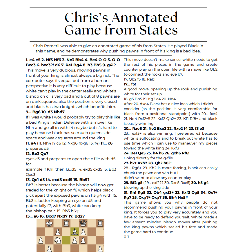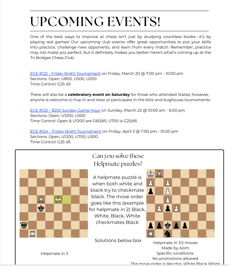 You'll also find a collection of matches played by club members at States, unique "helpmate" puzzles where both sides work together to find a checkmate, and details on our upcoming Friday night tournaments. Be sure to read the full issue to see the complete list of winners and sharpen your tactics for our next events!